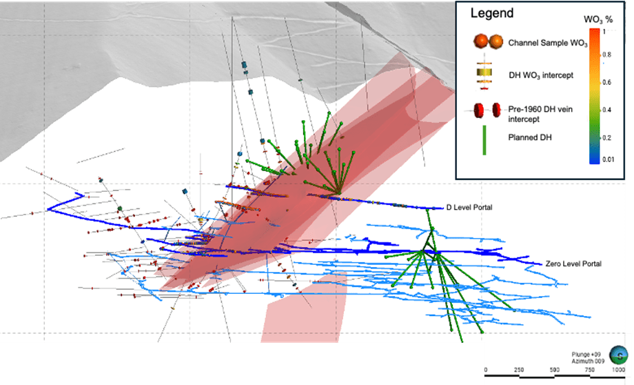 Figure 6: Isometric view looking north of IMA mine levels showing historical drillholes, planned drill holes, underground sampling and vein system wire-frame model.