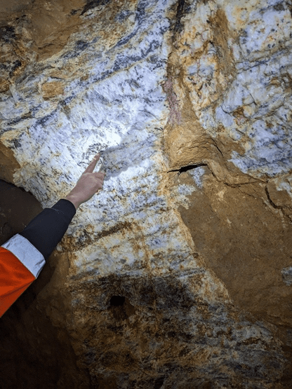 Figure 3: Geologist examining Hubnerite-tetrahedrite-sphalerite mineralization in quartz vein.